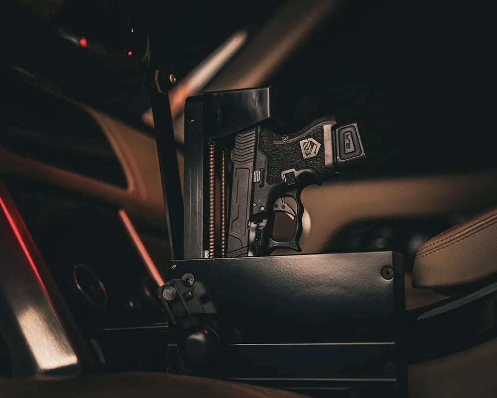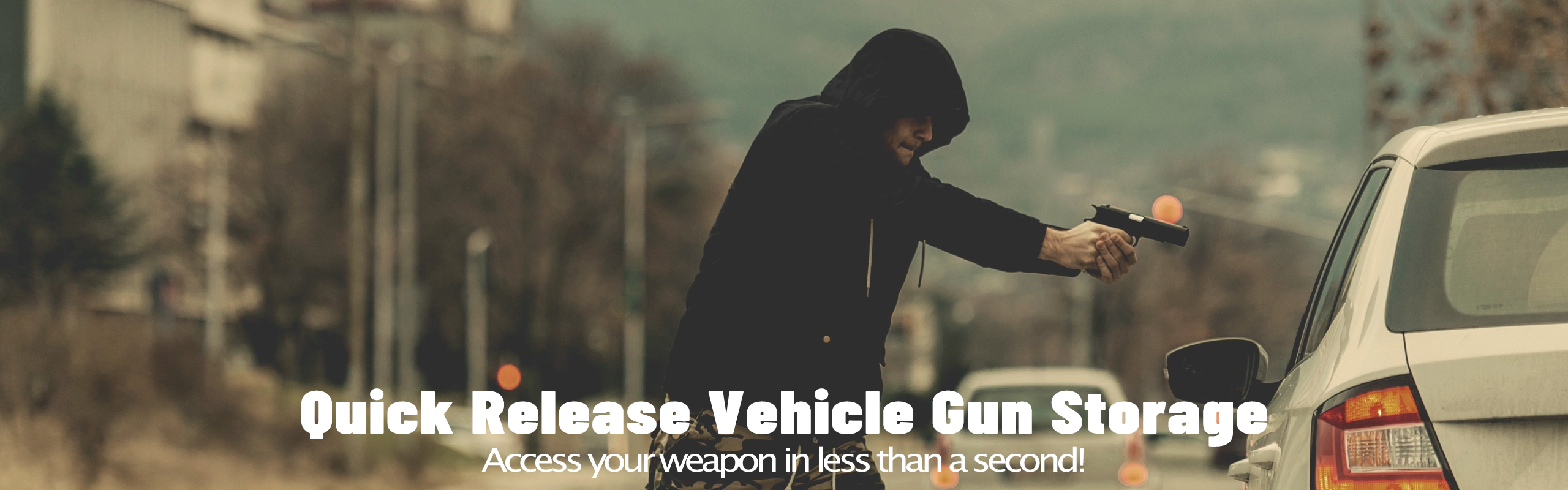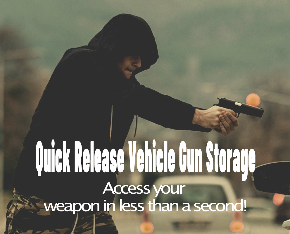 Quick Release Vehicle Gun Storage is a patented (US9340163B2; patent pending 16989722;) Quick Release Vehicle Gun Storage access system that delivers your firearm to you in a ready-to-arm yourself a position in under 1 second. Can be installed in your vehicle, ATV, and more.